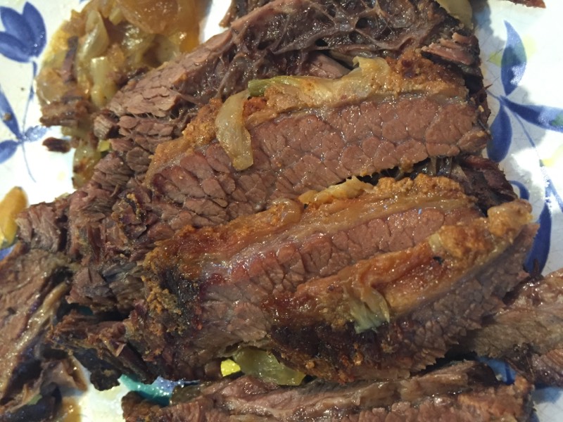 From there, we finished in the oven at 250 degrees for a few hours. Still concerned about dryness, I overdid it with the moisture, and really loaded up the pan with raw onions. The idea was that the onions would cook down, and steam the brisket in the covered pan. That they did, but it worked too well: the onion taste was too overpowering. I would do the same tactic, but cut back on the amounts.