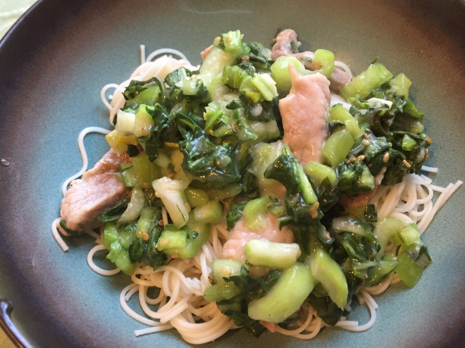 Preparation was easy. Take out the meat and drain the bok choy. Give the vegetables a rinse if they are too salty. Toss in a little corn starch and set aside. Dry the pork and lightly fry it with plenty of oil and a little grated ginger and white pepper. Once the meat is cooked, add the chopped bok choy and cook on medium heat for another three minutes or so, just until everything is blended and any remaining water has come out of the vegetables. Just before serving, add sesame oil and sprinkle on sesame seeds, and place in top of cool sōmen in a bowl.