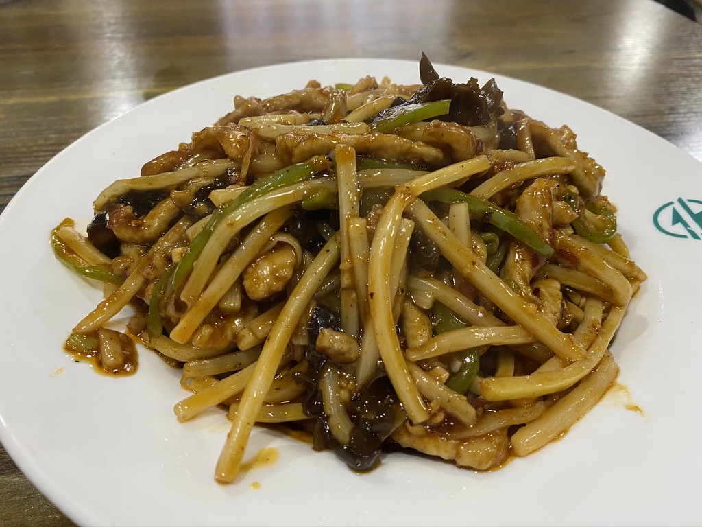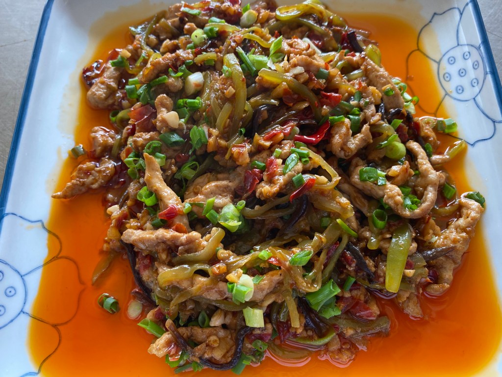 The Sichuan (aka real) version of the dish is very different. It starts with an intense burst of pickled ginger and pickled red peppers, which are chopped into a paste and fried with garlic. To this, add chopped strips of your favorite vegetable–a good rule of thumb is one crispy and one tasty–so bamboo plus shitake mushrooms, or carrots plus wood ear. The meat needs to be prepared beforehand by chopping super thin, basting in onion, cooking wine, ginger, white pepper, and corn starch, and then a quick dunk in hot oil. It sounds like some work, but the texture is exquisite. The meat gets tossed in with the vegetables, fried around, and finally finished off with a quick few spoons of vinegar, sugar and corn starch. The version I had in Shandong was all sugar and starch, but in Sichuan, these are just an accent. The difference is night and day.