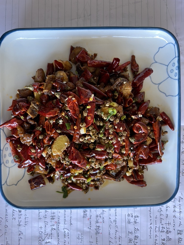 And you need a lot of them. In volume, I would aim for a chili:chicken ratio of 2:1, and that’s before the chicken is cooked. Since you’re aiming for the chicken to dry out, it’s going to shrink quite a lot. The result is a big plate of dried chilis that you need to pick through to find the pieces of chicken. This makes lazi ji a great dish to share over beers, and while everyone is poking around the plate, someone is more or less required to make the observation that we are “looking for chicken among the red lanterns,” which sounds exactly like “looking for prostitutes in the red light district.”
