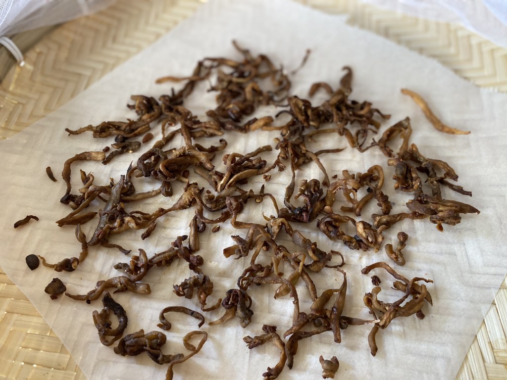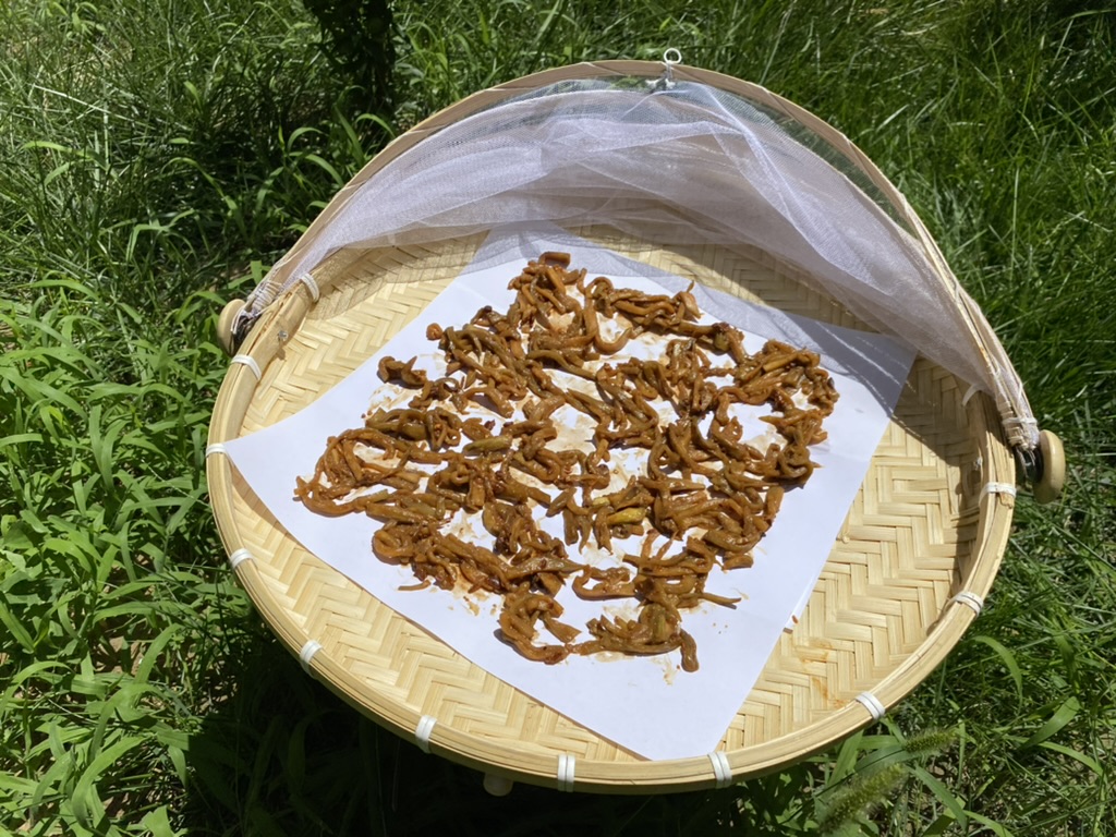 I have to say, this worked out pretty well. I was skeptical of slicing it so thin, but even these thin strips took three hours to dry out, under a baking 40 degree sun. The taste is pretty nice. I didn’t add all the spices in the recipe, opting instead for a basic mix of bean paste, Sichuan pepper, and dried orange peel. To my surprise, it was the orange peel that really stood out.