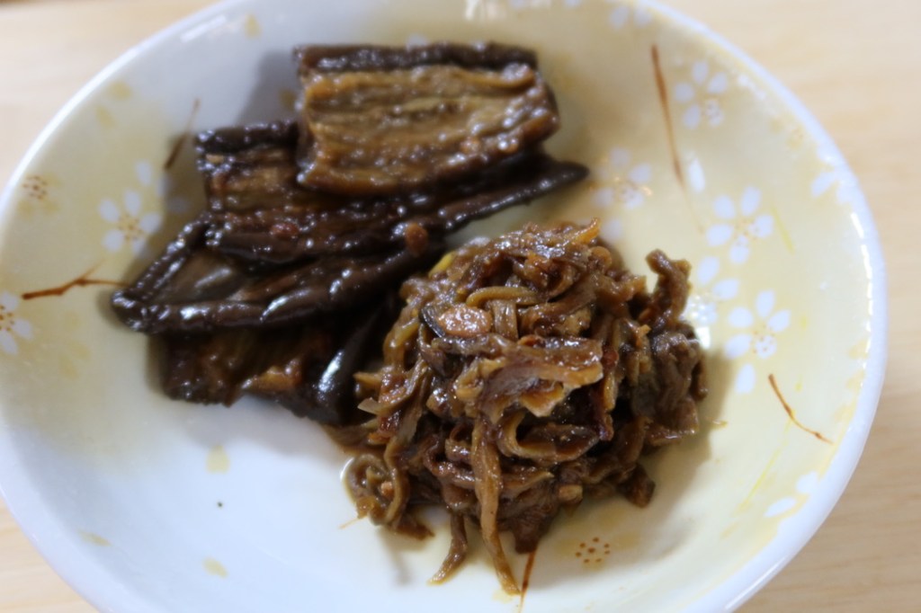 Chop a fresh eggplant into fine threads, dip in boiling water, dry, and evenly coat with a mixture of salt, bean paste, Sichuan pepper, dill, fennel, licorice, orange peel, almond, and red bean paste. After sun drying and steaming the pieces, store them. When time to eat, soften them in boiling water, and fry in sesame oil.