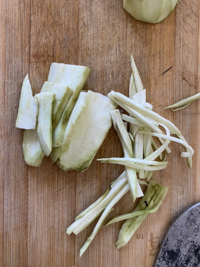 Today I made a dish from Zhongkuilu, a 12th century book of recipes. Zhongkuilu deals mostly with food preservation, techniques like brining, fermenting, salting, and sun-drying. Preserving changes the taste, and you cook with that new taste–it’s the difference between pork belly and bacon.