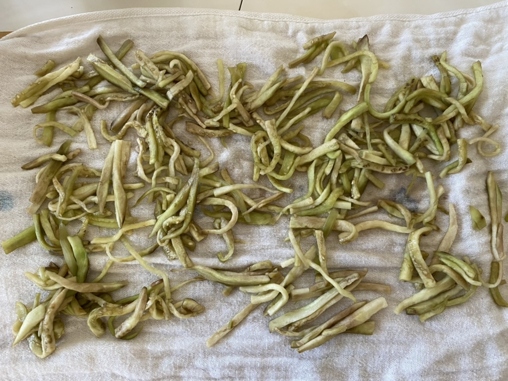So what we are doing is very lightly (15 seconds) parboiling the sliced eggplant to cook out the water, then tossing in a mix of seasoned paste, and sunning until completely dry–enough to be able to not go bad in a 12-century kitchen.