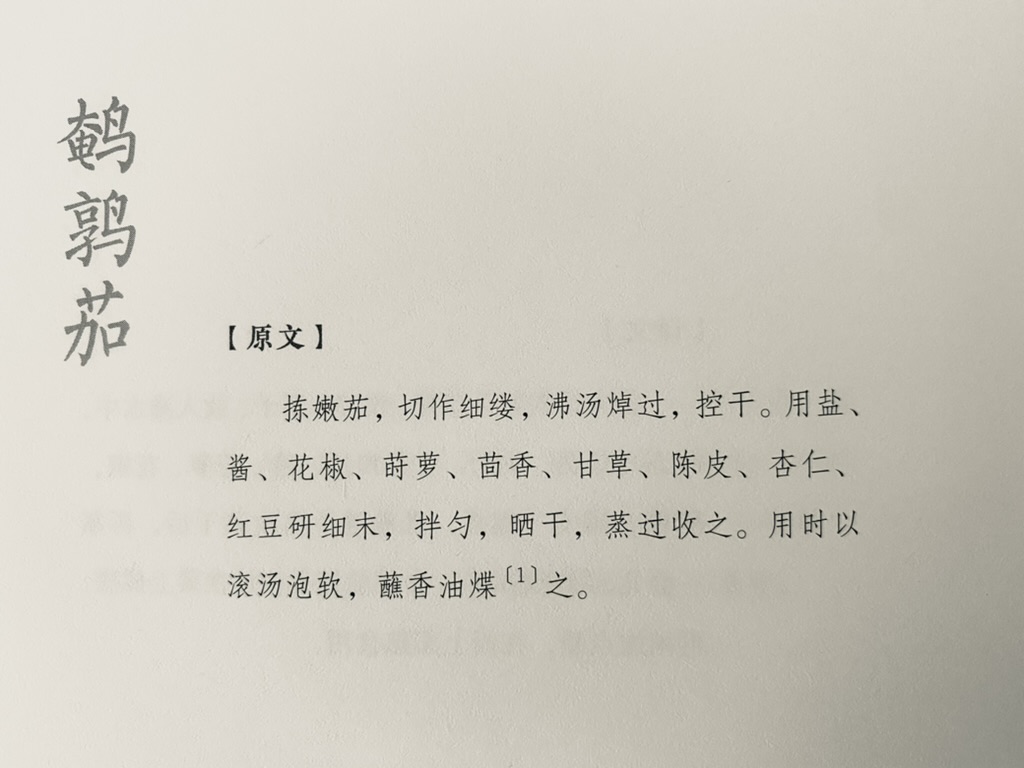 揀嫩茄,切作細縷,沸湯焯過,控幹。用鹽、醬、花椒、蒔蘿、茴香、甘草、陳皮、杏仁、紅豆研細末,拌勻,曬乾,蒸過收之。用時以滾湯泡軟,蘸香油炸之。