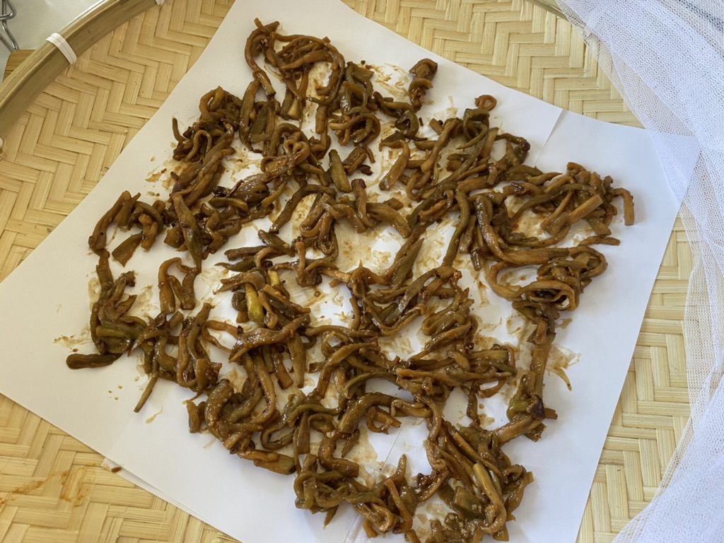 I have to say, this worked out pretty well. I was skeptical of slicing it so thin, but even these thin strips took three hours to dry out, under a baking 40 degree sun. The taste is pretty nice. I didn’t add all the spices in the recipe, opting instead for a basic mix of bean paste, Sichuan pepper, and dried orange peel. To my surprise, it was the orange peel that really stood out.