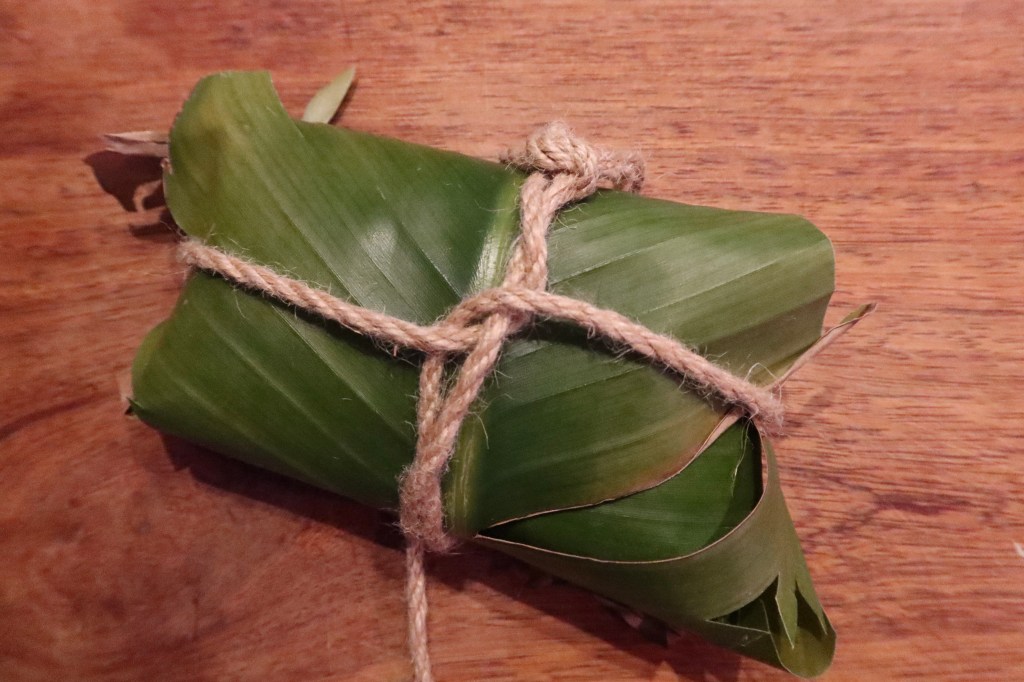 I soaked and boiled soybeans, let them cool, mixed in salt and wrapped everything in a clean cotton cloth. Since I had no grass lying around, I just wrapped the whole thing in a banana leaf, making sure to keep it loose enough for air flow. As a control, I also made a batch of tempeh using the packaged mould starter used for making laozao.