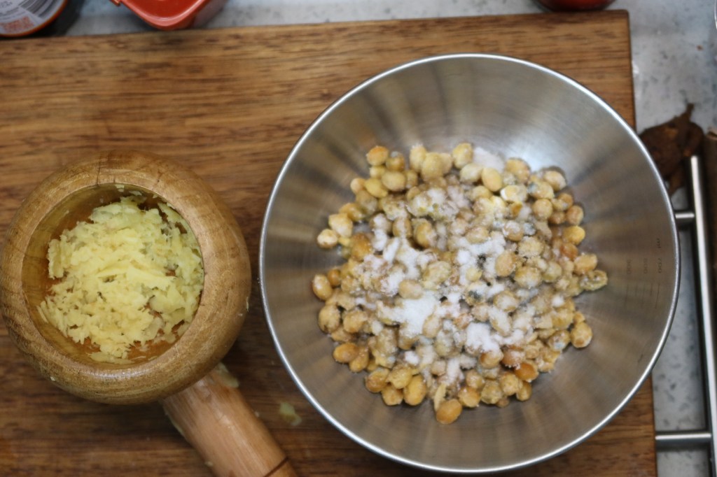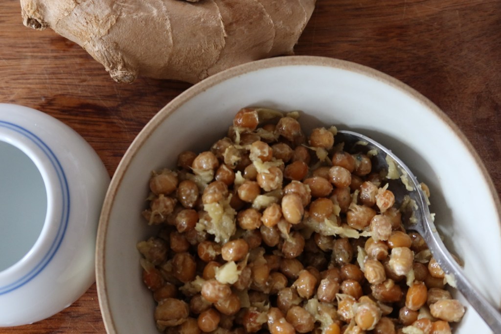 Wash soybeans clean and boil until extremely soft. Use a bamboo strainer to fish them out and mix with salt. Place the beans inside a cloth bag or bamboo container and cover with grass. In warm spring season, they will be ready after 3 or 4 days. In cold winter, it will take 5 or 6. Hot summer will not work for this. It is ready when the mash gives off heat and makes threads (when you pull it apart). Mix in mashed ginger and finely crushed salt in order to keep it from going bad. When it is mixed, place inside a fermenting jar. It will be ready to eat after ten days or more. These are equally good with fried or steamed meat.