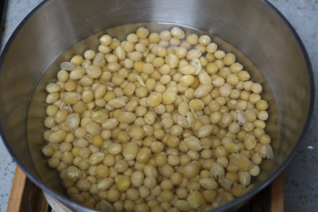 大黄豆淘净,煮极烂,用竹筛捞起。将豆汁用净盆滤下,和盐留好。豆用布袋或竹器盛之,覆於草内。春暖三四日即成,冬寒五六日亦成,惟夏日不宜。每将成时,必发热起丝,即之去覆草,加捣碎生姜及压细之盐,和豆拌之,然须略咸方能耐久。拌后盛坛内,十余日即可食。