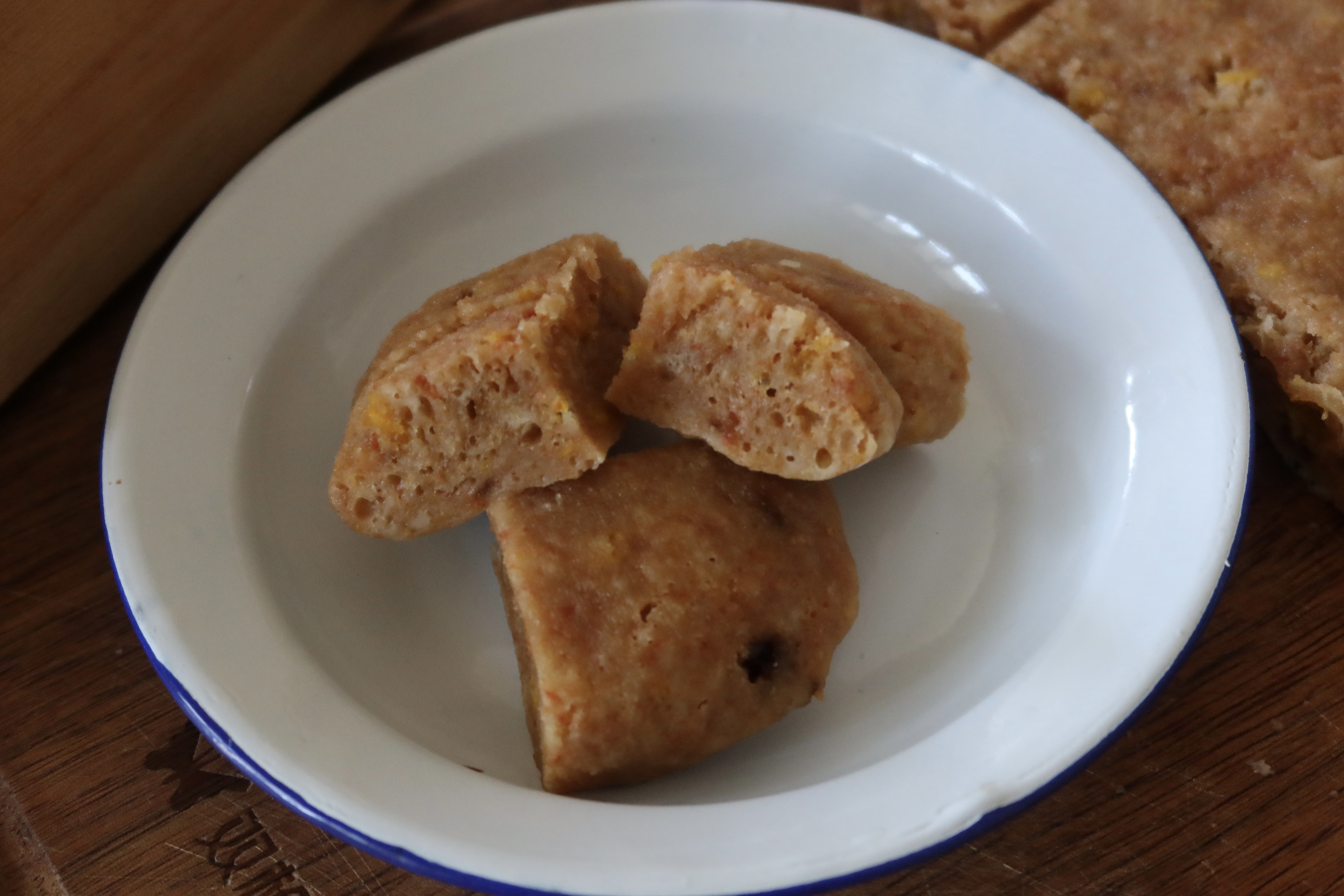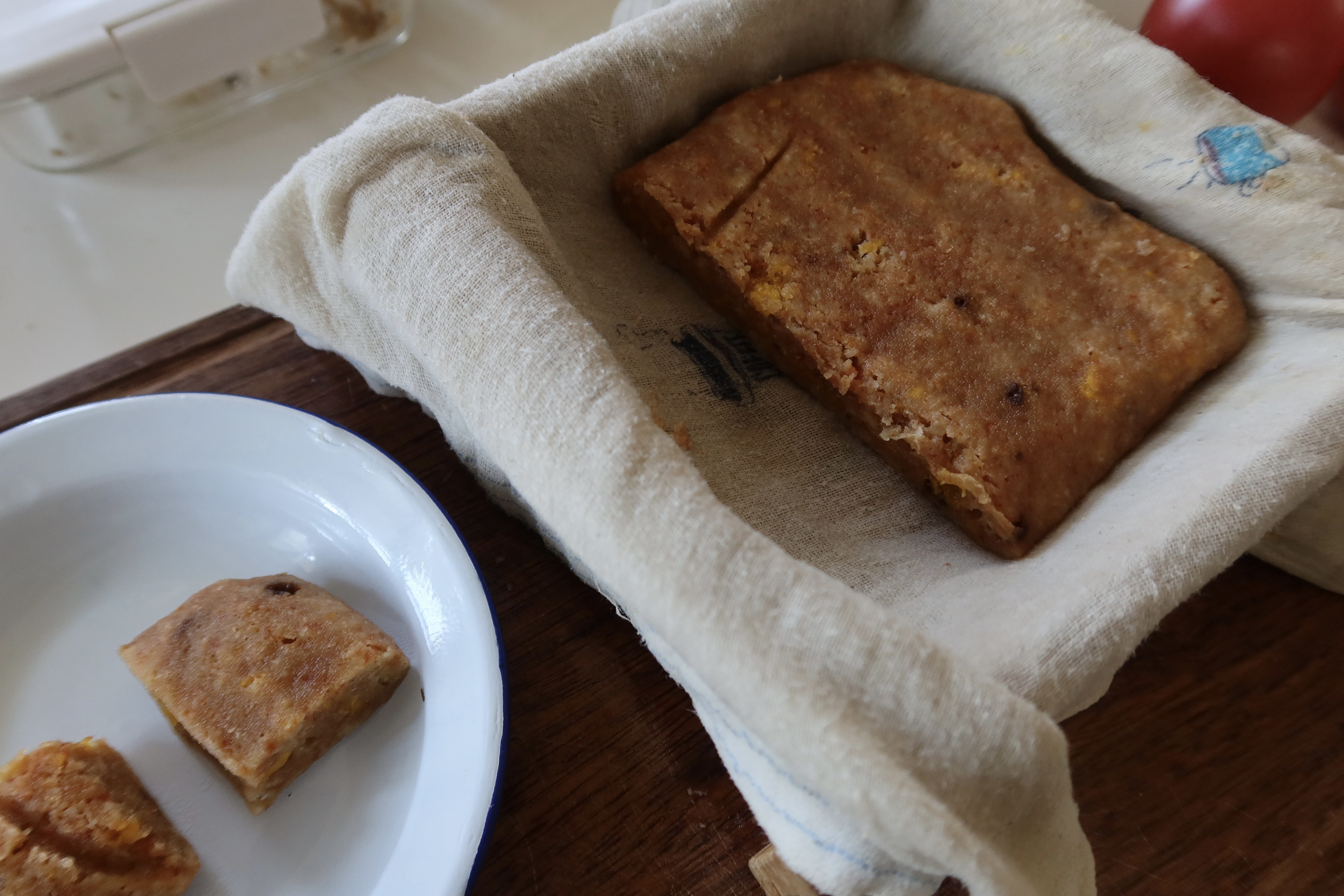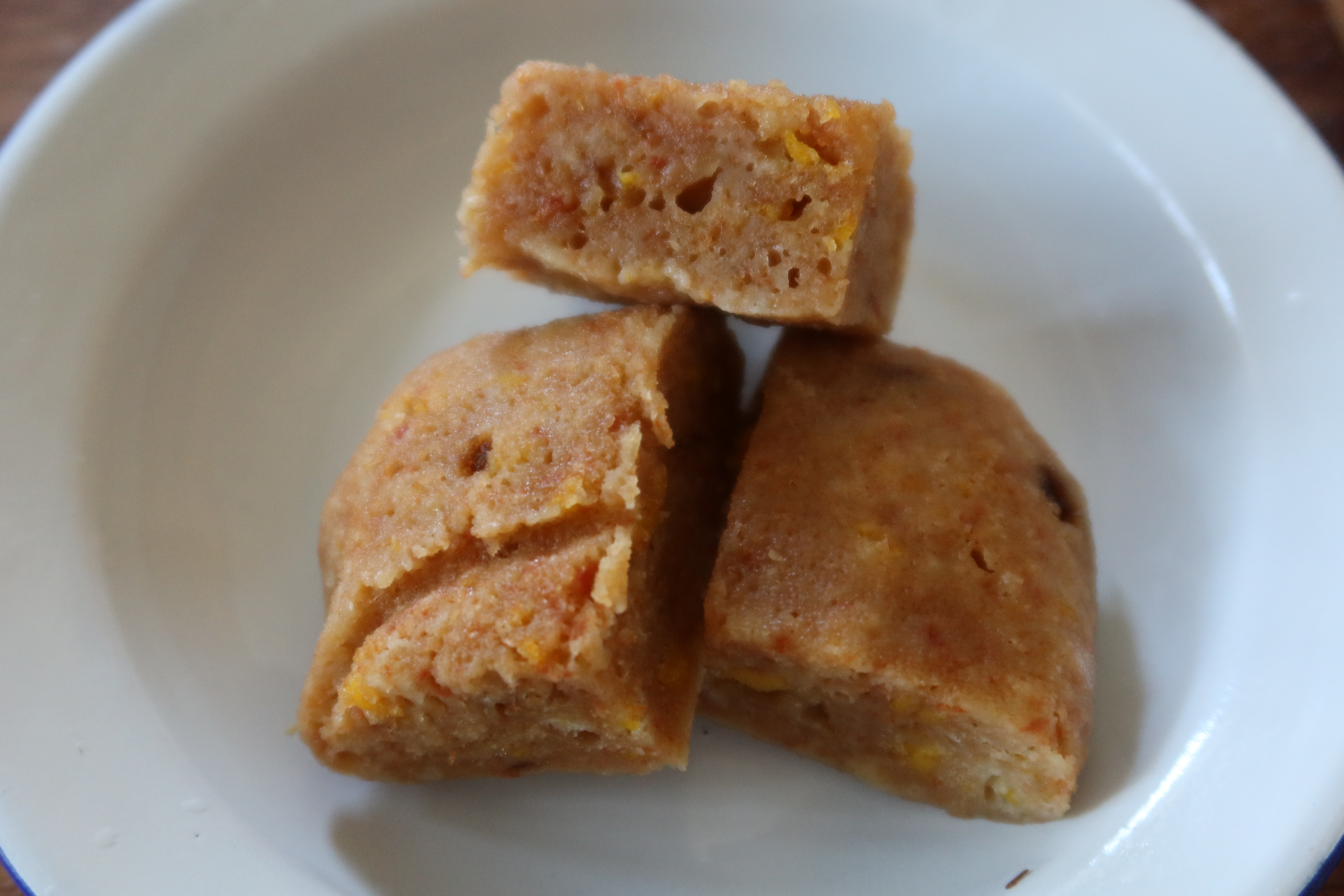 And how did it turn out? Surprisingly cakey, I’m pleased to say. The step of mixing the yolks and sugar into the beaten egg whites drove home that what we’re making here is a mousse–albeit a pretty heavy one. Add the rest of the ingredients, and you end up with a pretty ordinary cake batter consistency. Had I thought through the instructions better, I would have premixed some of the ingredients: the sugar and egg yolks, and the tomatoes with the flour. That would have made it easier to simply fold these into the egg whites, rather than needing to mix them. Want to save the trouble of separating and beating the eggs? I would guess that a half teaspoon of baking powder would give roughly the same rise.