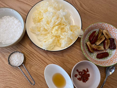 You can make a similar dish by swapping out the white fungus for Asian pears, peeled and cut into large chunks. Swap out the dates for a few very thin strips of dried tangerine peel. You could even make something similar using pears and nothing else. Slowly boiled pear concentrate makes another lovely, warming drink, enjoyed across northern China.