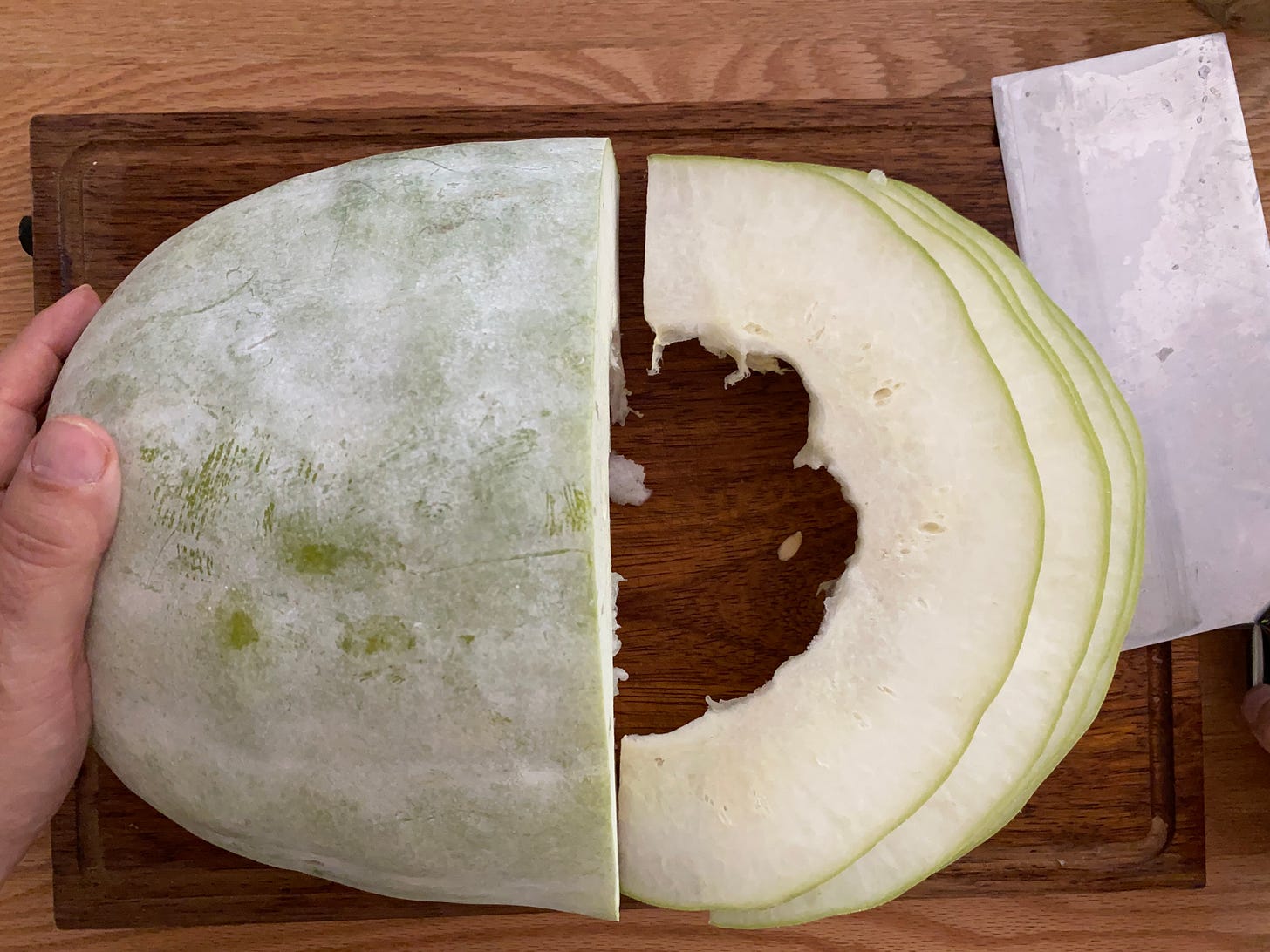 I also acquired a fresh winter melon. Quite a beast, as winter melons are wont to be. This one is the size of a very large watermelon and will last just about as long, so I need to get creative and fast. Seeing that two pots of soup had barely put a dent in my newfound melonic abundance, I decided to try my hand at drying a very small portion of the remainder. I cut slices thick enough to stand on their own and arranged them on a tray in front of a breezy open window. Additional structural integrity in the form of a few mushrooms ensured the slices didn’t fall over. After three days, I had a tray of dried vegetables and an inspiration for the lovely fall soup below.